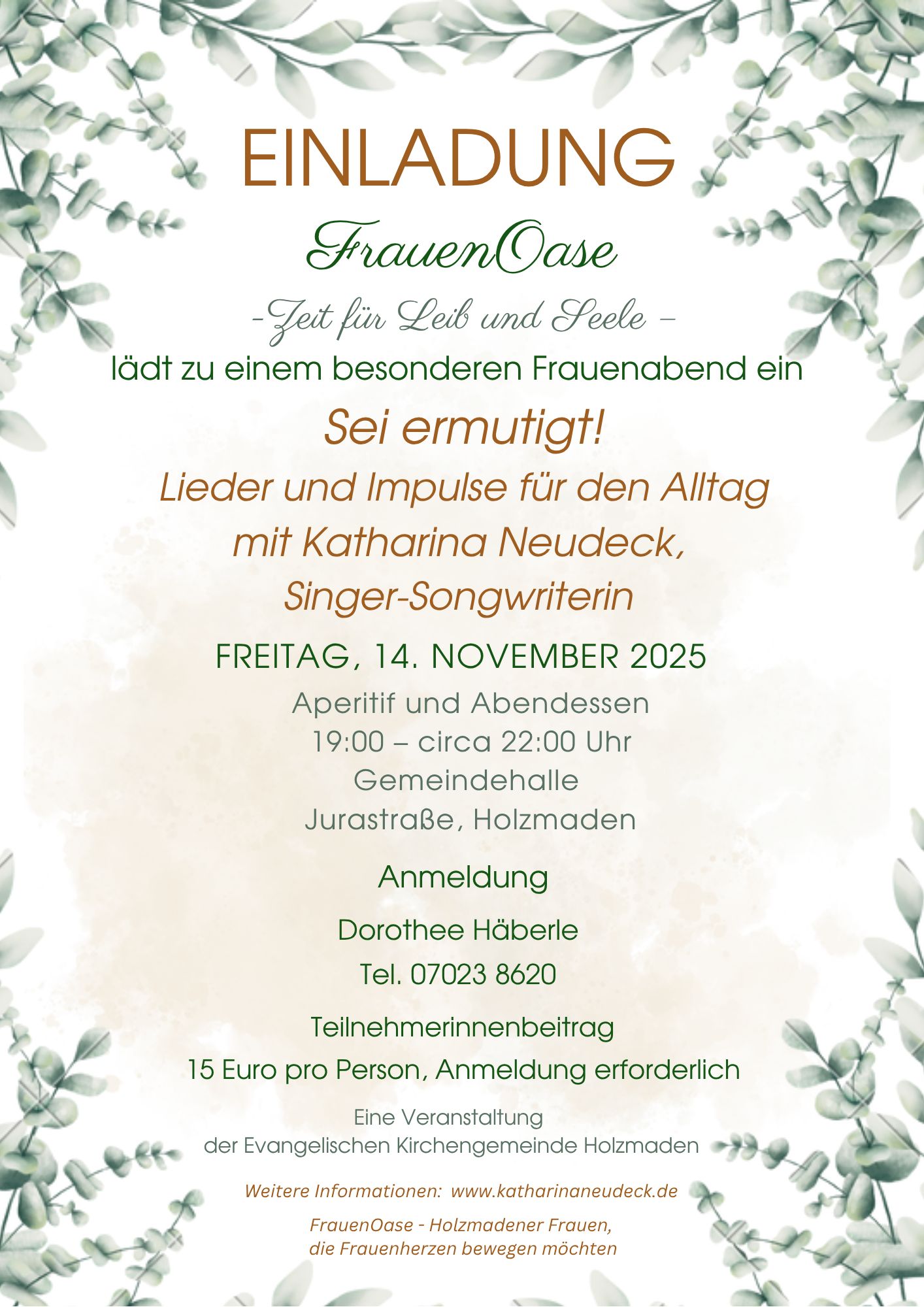 Die Gruppe „FrauenOase” in Holzmaden möchte Frauenherzen bewegen und veranstaltet seit 2023 jährlich einen Frauenabend. Am 14. November 2025 findet um 19:00 Uhr in der Gemeindehalle ein weiterer Frauenabend mit Aperitif, Abendessen und dem Auftritt der Sängerin Katharina Neudeck statt. Da die Teilnehmerzahl begrenzt ist, ist eine Anmeldung unter 07023 8620 erforderlich. Die Teilnahmekosten betragen 15 Euro.