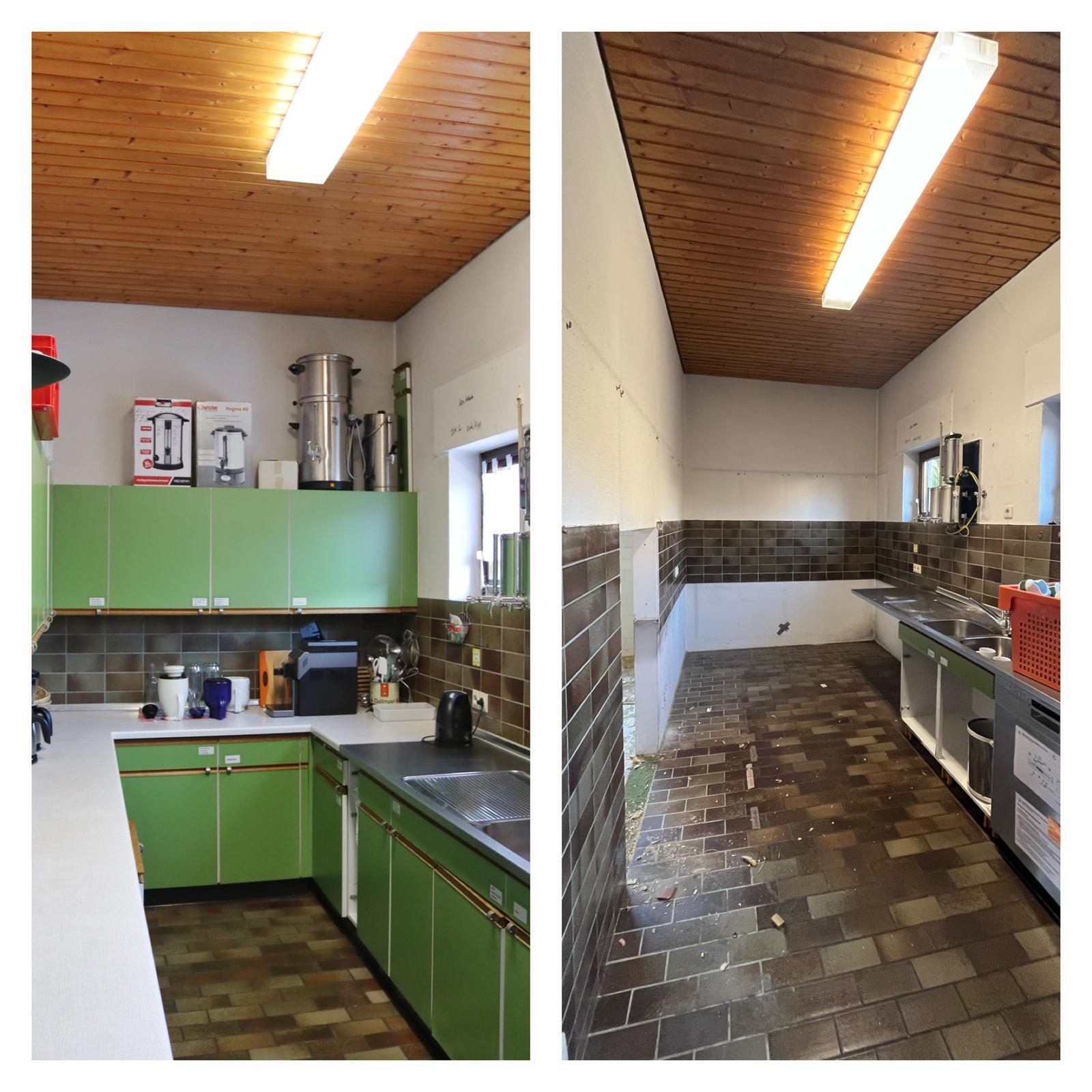 Die Küche vorher und nachher Zuerst wurde die Küche ausgeräumt und dann die Hängeschränke, die Arbeitsplatte und die Unterschränke entfernt. Die Spüle bleibt noch einige Zeit erhalten um Wasser zapfen zu können.
