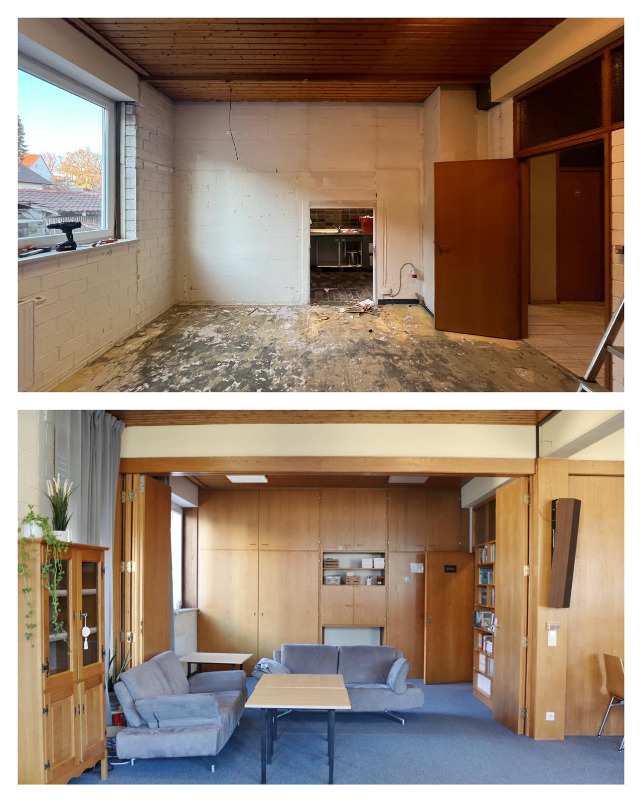 Der Gebetsraum (Nebenzimmer) nachher und vorher So sieht der Nebenraum nun aus und das untere Bild zeigt, wie es vorher war. Die Wand zur Küche wird um etwas mehr als einen Meter nach vorne versetzt, um in der Küche mehr Raum zu gewinnen.